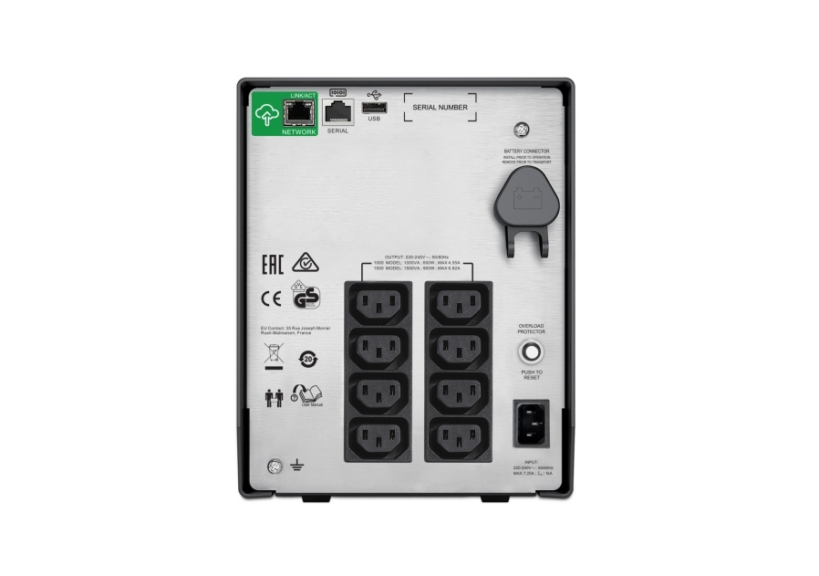 Smart-UPS range, an intelligent and efficient network power protection offer from entry-level to scalable runtime. This 1000VA/600W line-interactive UPS provides pure sine wave power to support critical electronics during power disruptions. The tower mount SMC has a Smart Connect port for cloud-based remote power monitoring, UPS firmware upgrades, remote diagnostics and email notifications with recommended actions.