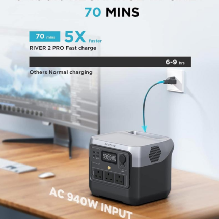 RIVER 2 Pro beats the industry charging speed standard, fully charging in only 70 minutes. That’s 5x faster than other portable power stations on the market and 27% quicker than previous generations. Fully charge RIVER 2 Pro while you pack your bags, so you’ll always be ready for a last-minute trip.