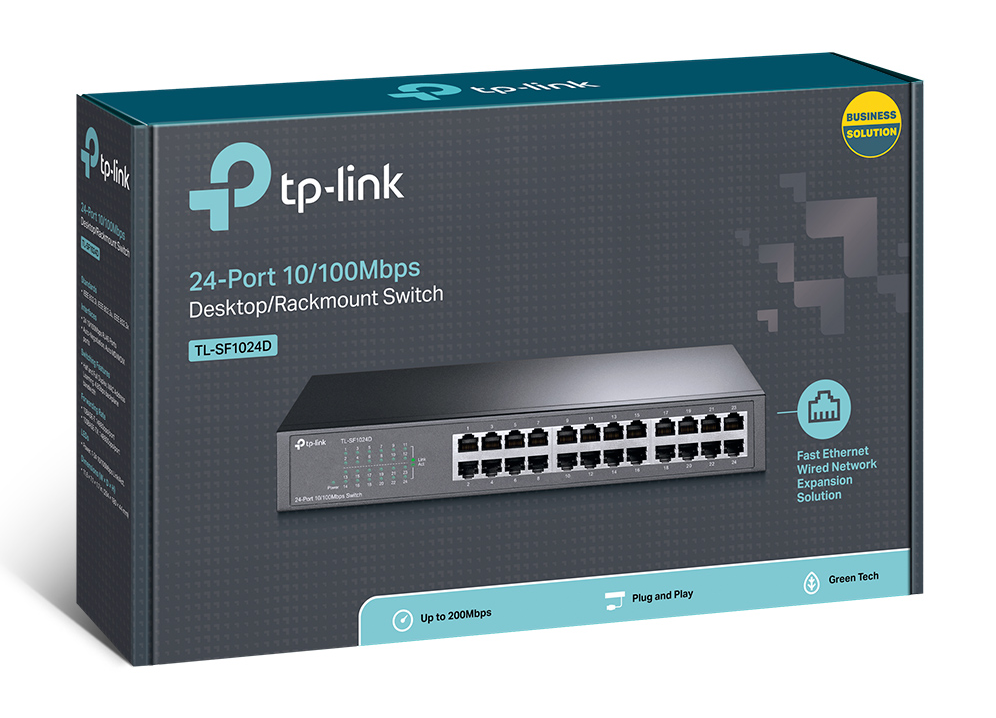 The Tp-link 24-port 10/100Mbps Desktop/Rackmount Switch TL-SF1024D provides you with a high-performance, low-cost, easy-to-use, seamless and standard upgrade to improve old network to 100Mbps network. All 24 ports support auto MDI/MDIX, no need to worry about the cable type, simply plug and play. Moreover, with the innovative energy-efficient technology, the TL-SF1024D can save up to 75%* of the power consumption and 80% of the packaging material can be recycled, making it an eco-friendly solution for your business network.