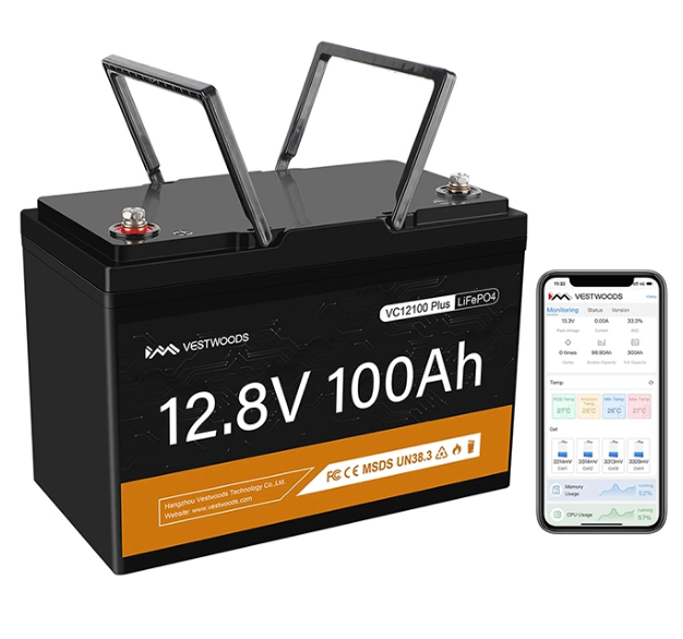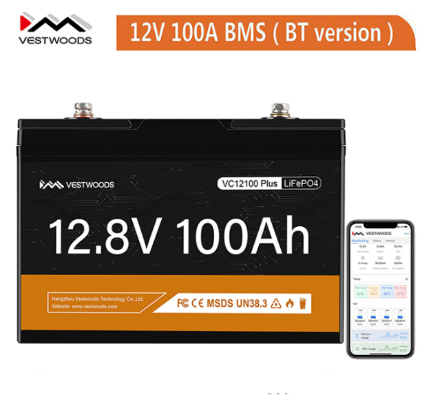 The VESTWOODS Smart 12V 100Ah LiFePO4 Lithium Rechargeable Battery is a Lithium Iron Phosphate (LiFePO4) battery designed for a variety of applications including RVs, solar systems, marine, home energy storage, and more. It has a capacity of 100Ah and a nominal voltage of 12.8V, providing 1.28kWh of usable energy.